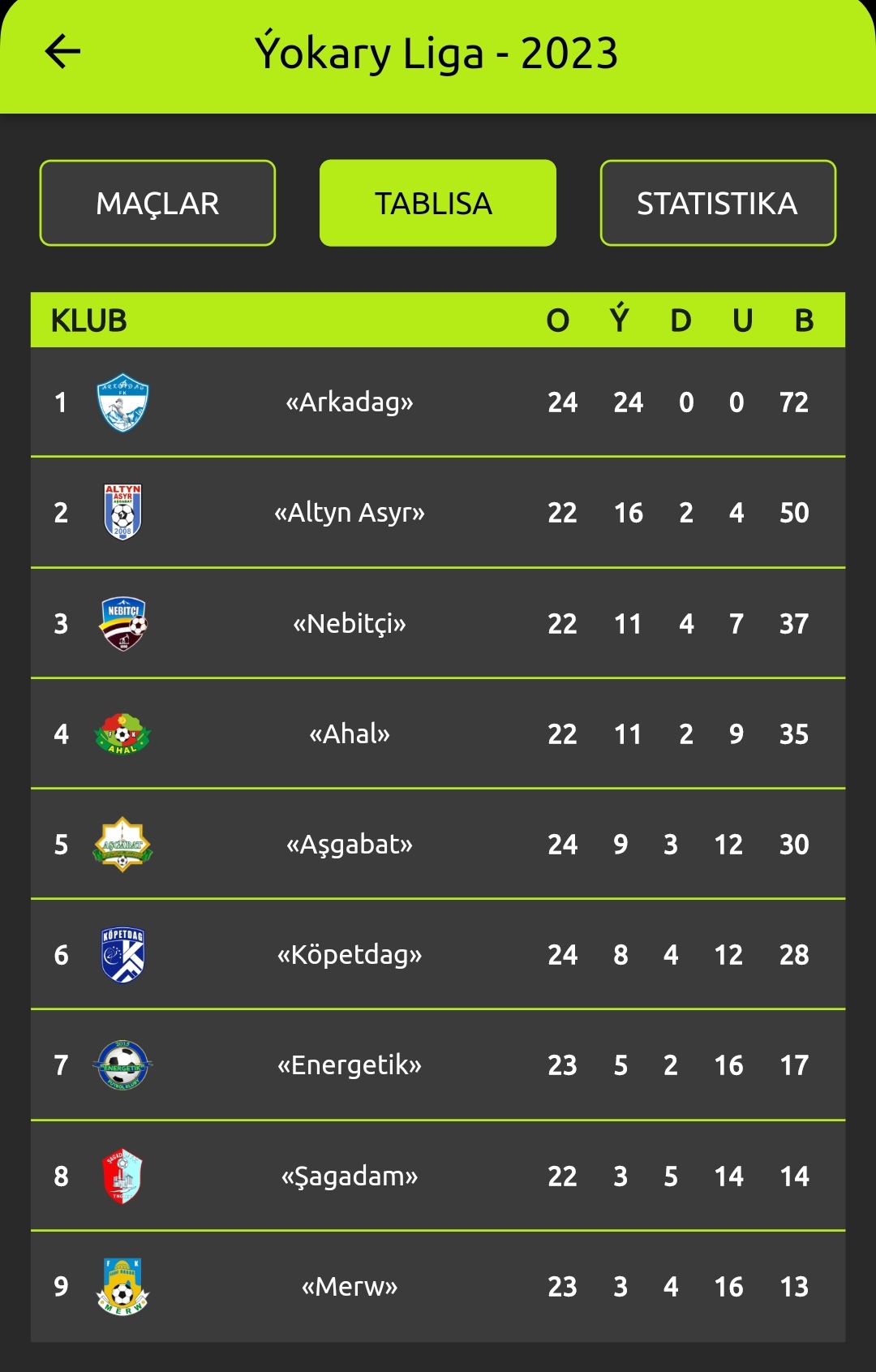 Şeýlelikde geçirilen duşuşyklardan soň wagtyndan öň çempionlyk derejesini gazanan “Arkadag” topary 24 oýundan 72 utuk toplady. Bassyr ikinji ýyl wise-çempionlygyny gazanan "Altyn Asyr" topary 22 oýundan 50 utuk toplady. 22 oýun geçiren "Nebitçi" (37 utuk) we "Ahal" (35 utuk) toparlary bürünç medala dalaş edýärler.