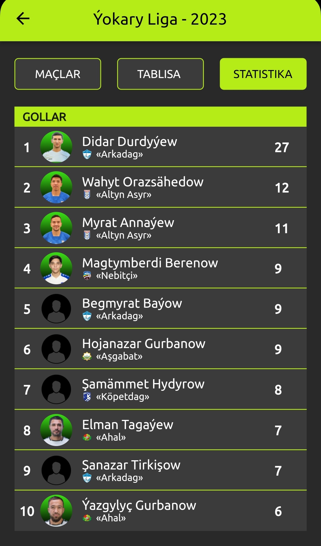 Ýeri gelende aýtsak, çempionatyň şu möwsüminde henize çenli 10-dan köp gol geçirip bilen 3 futbolçy bar. Olar «Arkadag» toparyndan Didar Durdyýew (27), «Altyn asyrdan» Wahyt Orazsähedowdyr (12) bilen Myrat Annaýew (11).