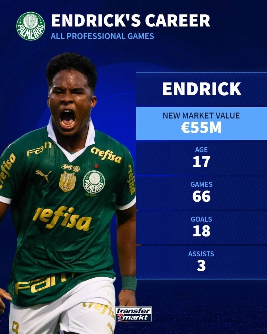 "Transfermarkt" internet portaly, Braziliýanyň Serie A ligasyndaky oýunçylaryň gymmatlyklarynyň ýene bir täzelenmesini amala aşyrdy, şondan soň «Palmeirasyň» 17 ýaşly hüjümçisi Endrikiň bazar bahasy 10 million ýewro ýokarlandy we häzirki wagtda 55 million ýewro bardy.