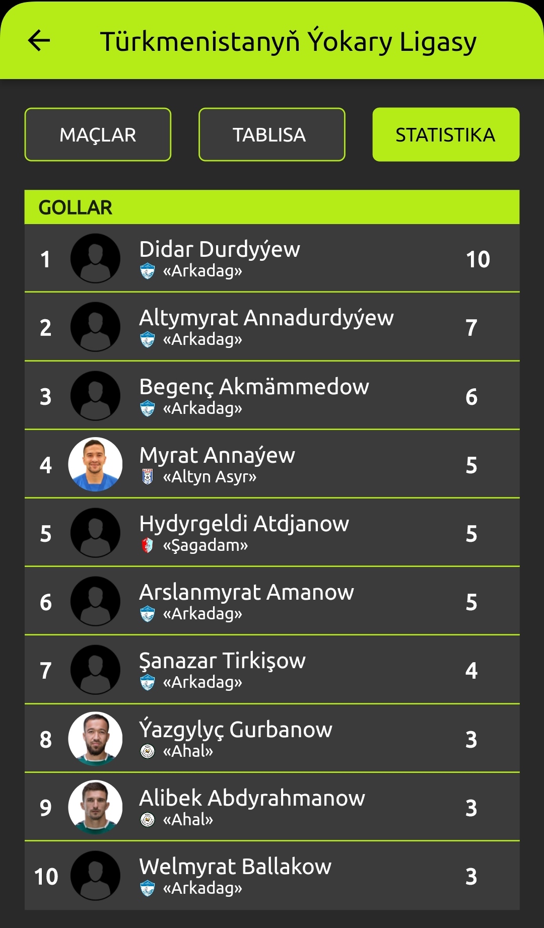 1. Didar Durdyýew («Arkadag») – 10 gol