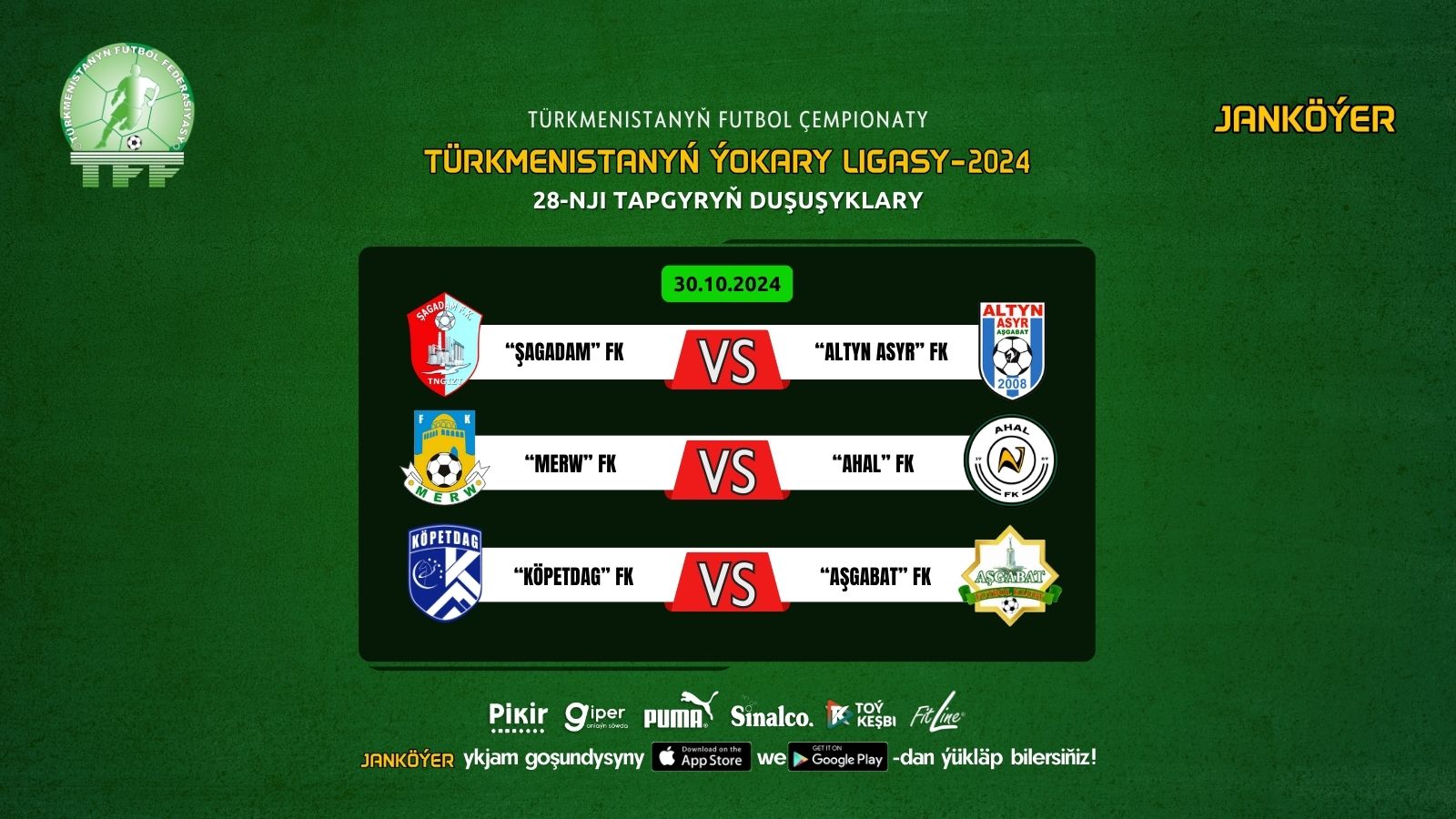Ertir – 30-njy oktýabrda Aşgabat, Türkmenbaşy we Mary şäherlerinde Türkmenistanyň futbol çempionatynyň Ýokary ligasynyň 28-nji tapgyrynyň üç duşuşygy geçiriler.