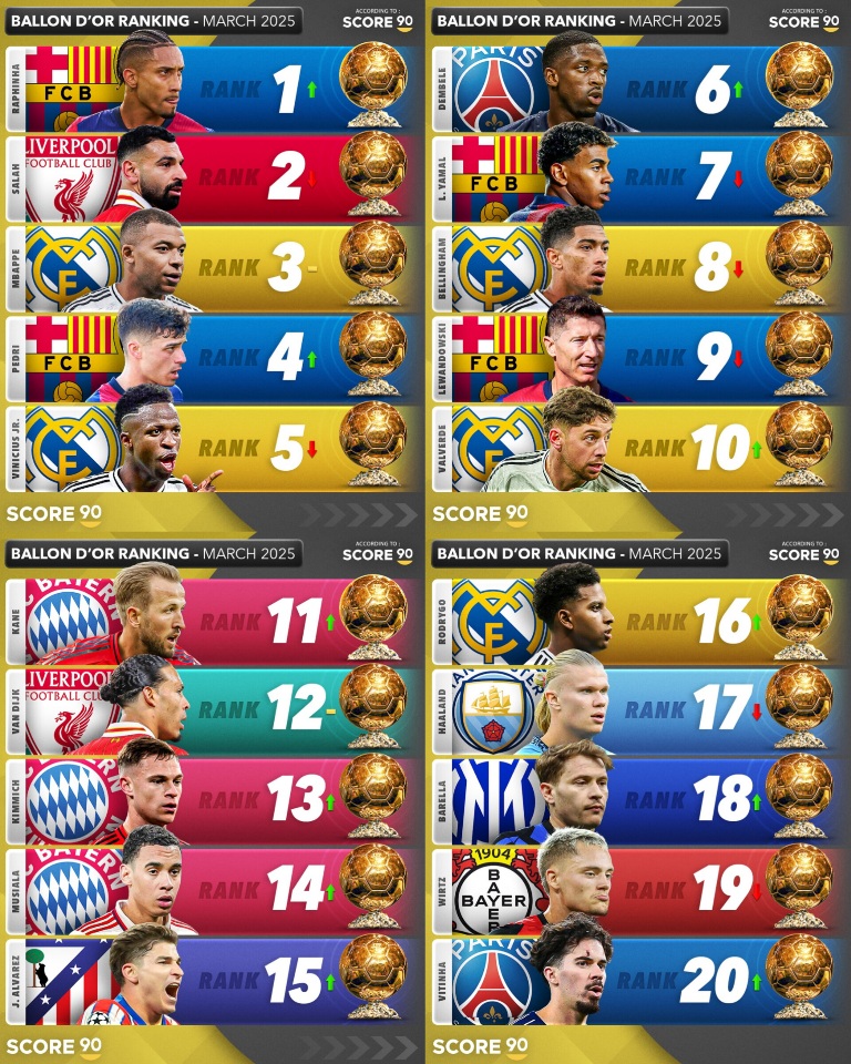 Rafinýa, Çempionlar ligasynda «Liwerpulyň» pleý-off tapgyrynda ýeňilmänkä birinji orny saklap gelýän müsürli hüjümçi Muhammet Salahdan öňe geçdi. Üçünji orunda «Real Madridiň» düzüminde ilkinji möwsümini geçirýän Kilian Mbappe ýerleşýär.