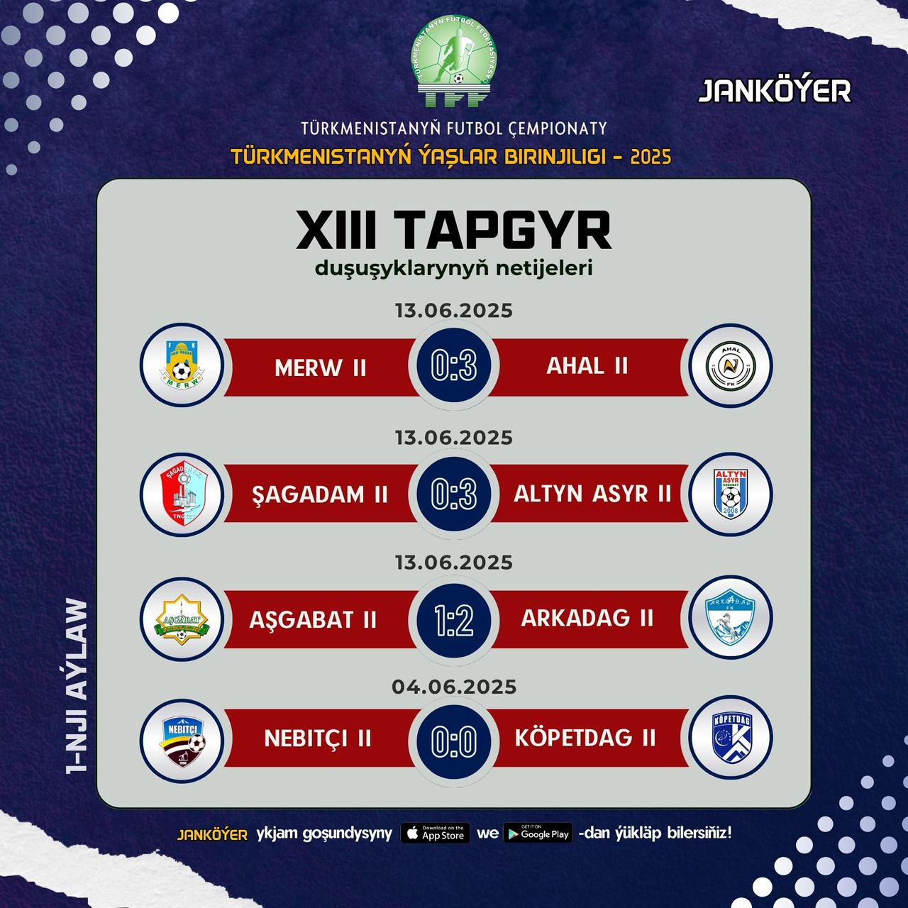 Türkmenistanyň futbol boýunça ýokary ligasynyň klublarynyň ýaşlar düzümleriniň arasyndaky çempionatyň 13-nji tapgyrynyň duşuşyklary geçirildi. Bu tapgyrda öňdebaryjy toparlar nobatdaky ýeňişlerini gazandylar.