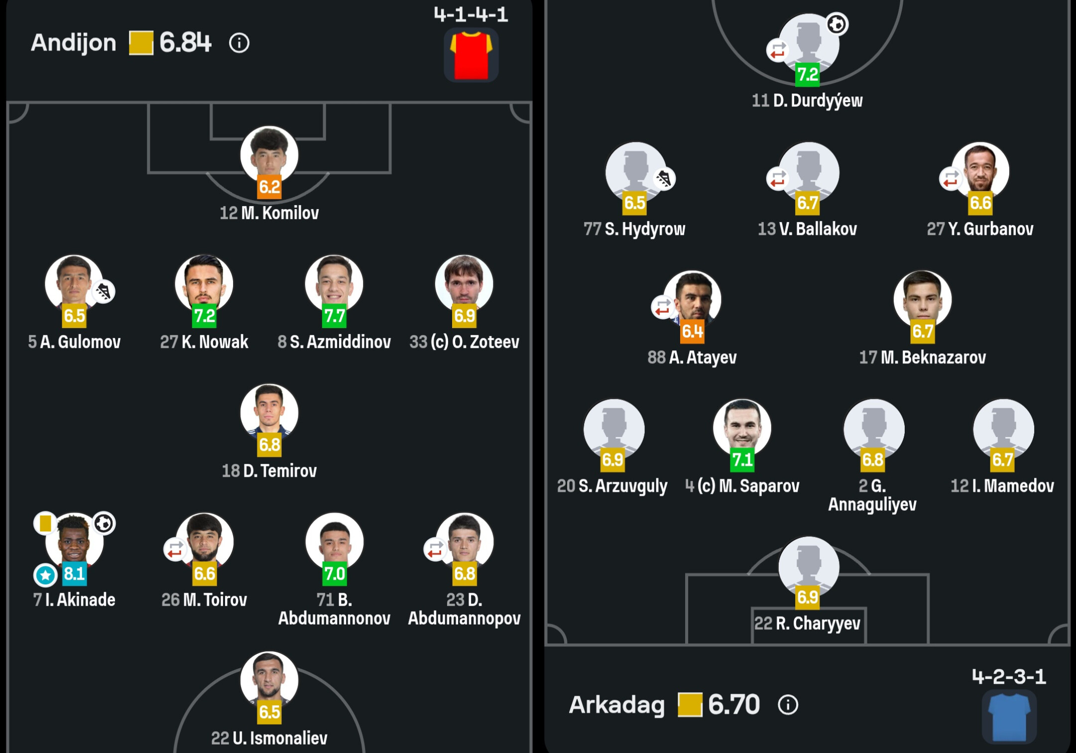 Ýarym goragçy Ahmet Ataýew duşuşykda iň pes ball alan oýunçy boldy. Oňa portal tarapyndan 6,4 ball berildi. Ýöne iki toparyň oýunçylarynyň görkezijileri babatynda alanyňda iň pes ball «Andijonyň» derwezeçisi M.Komilowa berildi ― 6,2 ball.
