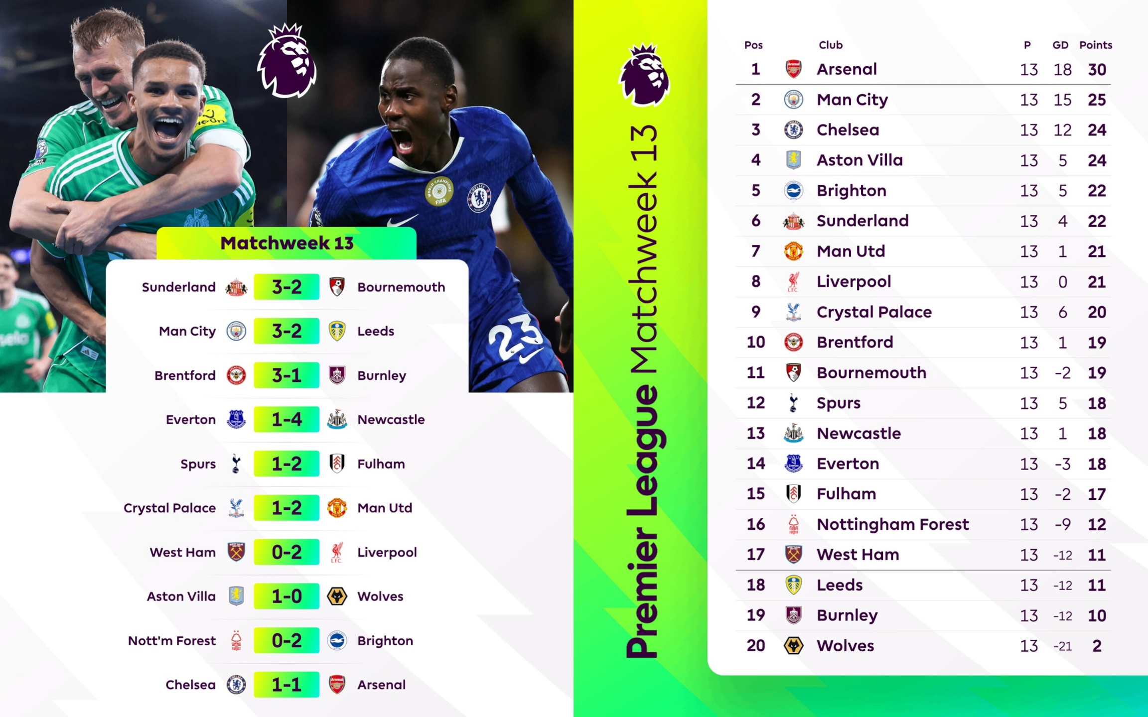 Angliýanyň Premýer-ligasynyň 13-nji tapgyrynyň netijeleri boýunça toparlaryň häzirki ýagdaýy belli boldy. Tapgyryň esasy oýny Londonda geçirildi — bu duşuşykda «Çelsi» öz meýdançasynda «Arsenaly» kabul etdi. Duşuşyk deňme-deň — 1:1 hasabynda tamamlandy.