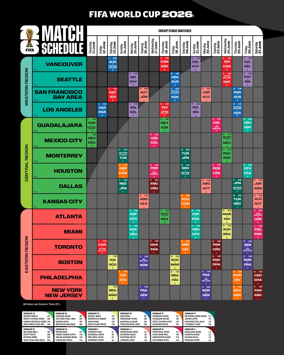 "FIFA" futbol boýunça Dünýä çempionaty-2026-nyň doly duşuşyklaryň senenamasyny öz resmi web sahypasynda neşir etdi. Ýaryş 16 şäherde, 11-nji iýundan 19-njy iýula çenli ABŞ, Kanada we Meksika ýurtlarynda geçer.