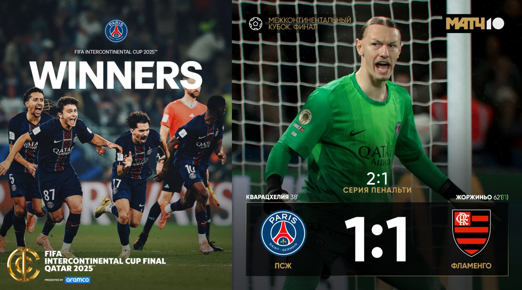 Kataryň Er-Raýan şäherinde geçirilen duşuşygyň esasy we goşmaça wagty 1:1 hasabynda tamamlandy. «PSŽ-niň» derwezebany Matweý Safonow 62-nji minutda penaltiden gol geçirtdi — topy Joržinýo tora girizdi. Parižlileriň goluny bolsa 38-nji minutda Hwiça Kwaratsheliýa geçirdi.