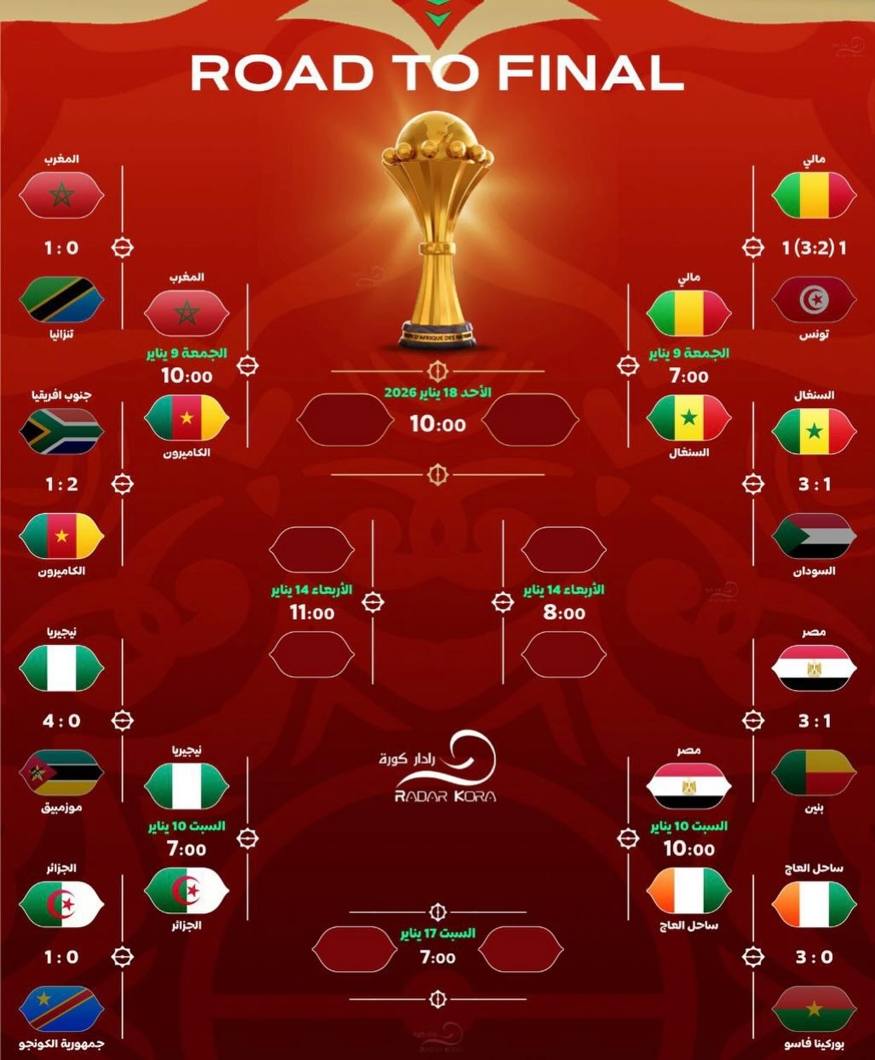 Çärýek final duşuşyklary 9–10-njy ýanwarda geçiriler. Ýarym final oýunlary 14-nji ýanwarda meýilleşdirilýär. Afrikanyň Milletler Kubogy-2025-iň ýeňijisi bolsa 18-nji ýanwarda geçiriljek final duşuşygynda belli bolar.