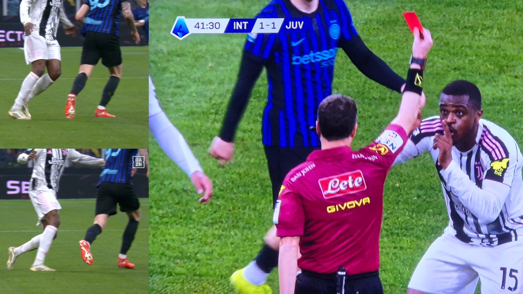 Duşuşygyň 42-nji minutynda goragçy Pýer Kalulu garşydaşyň meýdançasynda Alessandro Bastoni bilen göreşende baş emin Federiko La Penna tarapyndan ikinji sary kartyny alyp, meýdançadan çykaryldy. Gaýtalanýan wideolarda düzgün bozma bolmadyk ýaly göründi, emma göni gyzyl kart ýagdaýy bolmansoň "VAR" ulgamy gatyşyp bilmedi. Şeýle hem, Bastoniniň özi ýalandan ýykylmasy üçin ikinji sary kartyny alyp biljek epizod hökmünde hem ara alnyp maslahatlaşyldy.