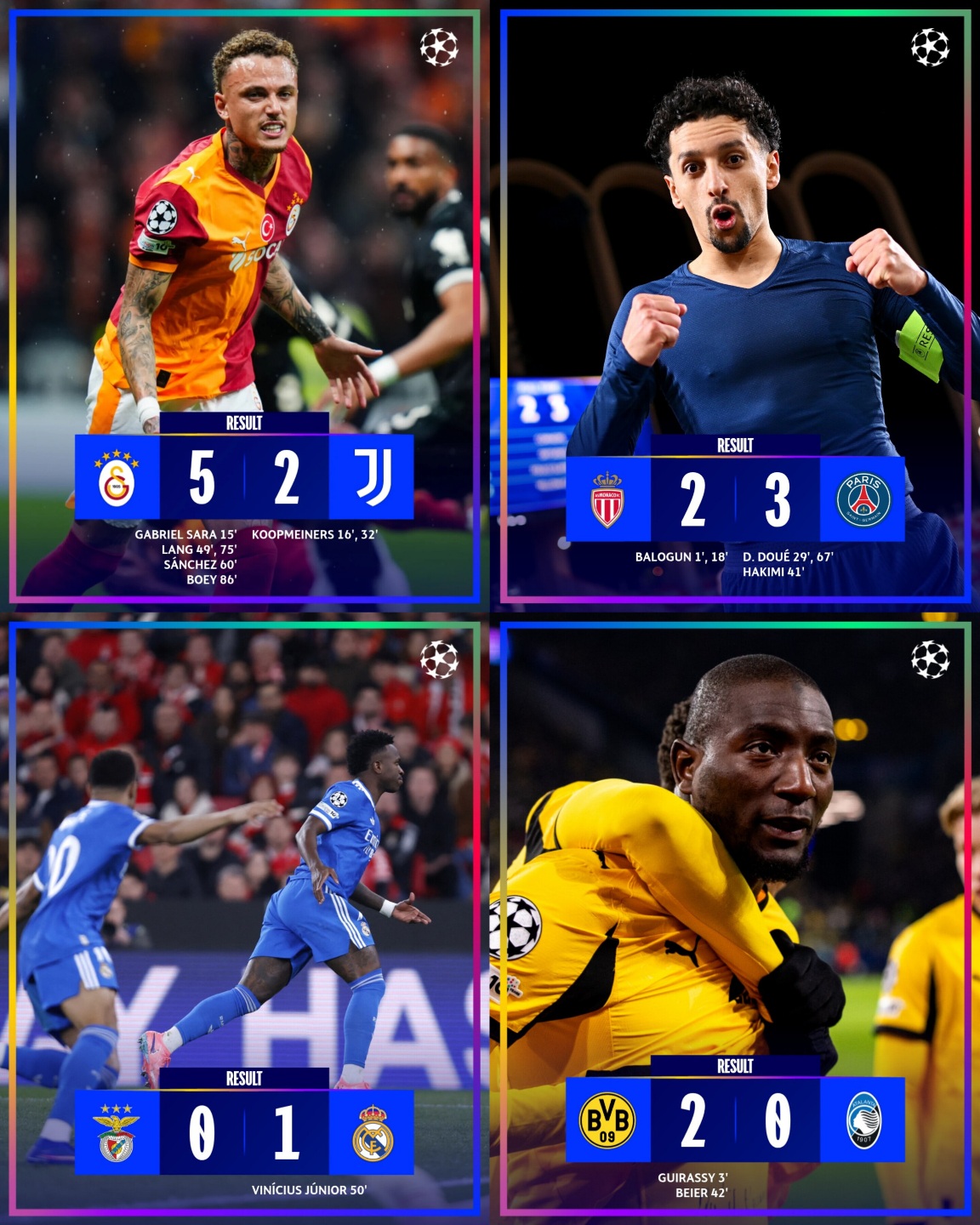 Stambulda geçirilen oýunda «Galatasaraý» öz meýdançasynda «Ýuwentusy» 5:2 hasabynda ýeňdi. Türk klubynyň gollaryny Gabriel Sara, Dawinson Sançes, Saşa Boeý we Noa Lang (2 gol) geçirdi. Turin klubynda bolsa Teun Koopmeýners (2 gol) tapawutlandy. Duşuşygyň iň gowy oýunçysy: Gabriel Sara («Galatasaraý»).