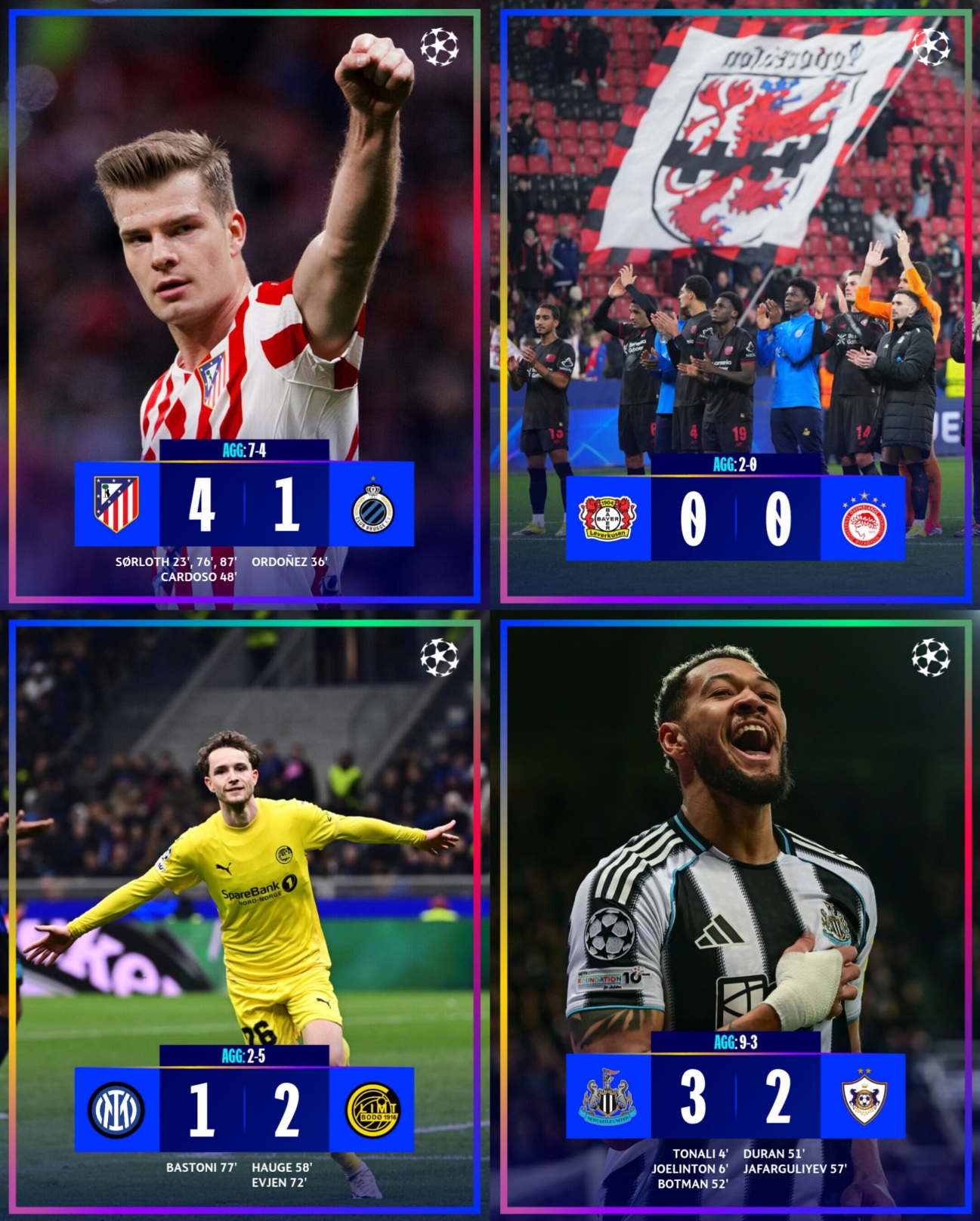«Atletiko Madrid» öz meýdançasynda «Brýugge» bilen garşylaşyp, duşuşygy üstünlikli tamamlady we iki oýnuň jemi boýunça 1/8 finala çykdy. Duşuşykda Aleksander Serlot het-trik edip, toparynyň esasy gahrymany boldy. Şeýlelikde, madridliler indiki tapgyrda «Tottenhem» ýa-da «Liwerpul» bilen duşuşar.