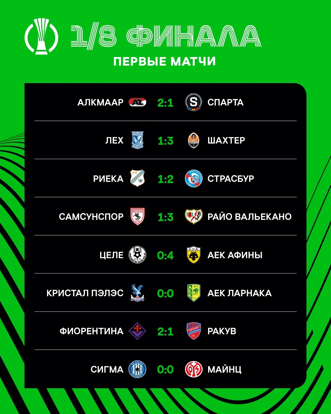 Günüň iň uly hasaply ýeňşi «Tselýe» – «AEK» duşuşygynda hasaba alyndy. Bu oýunda grek topary garşydaşyny 4:0 hasabynda ýeňip, indiki tapgyra çykmak üçin örän amatly ýagdaý gazandy.