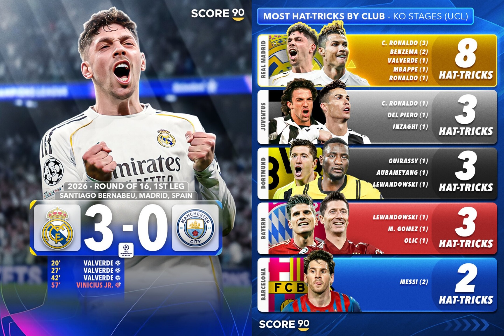 Ýewropanyň iň abraýly klublar ýaryşy bolan Çempionlar ligasynda «Real Madrid» topary ýene bir möhüm görkezijide öňdebaryjylygyny berkitdi. «Mançester Siti» toparyna garşy geçirilen oýunda Federiko Walwerde üç gol geçirip, het-trik etdi we bu görkeziji bilen «Realyň» rekordy berkidildi.