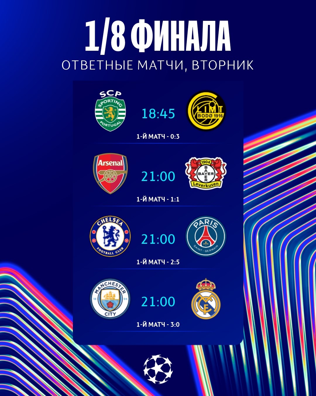 Gijäniň esasy duşuşyklarynyň biri Angliýada geçiriler — «Mançester Siti» bilen «Real» ýene-de pleý-off tapgyrynda ýüzbe-ýüz bolar. Madridde geçirilen ilkinji oýunda «Real» 3:0 hasabynda ýeňiş gazanypdy, şol duşuşykda Federiko Walwerde het-trik edipdi.