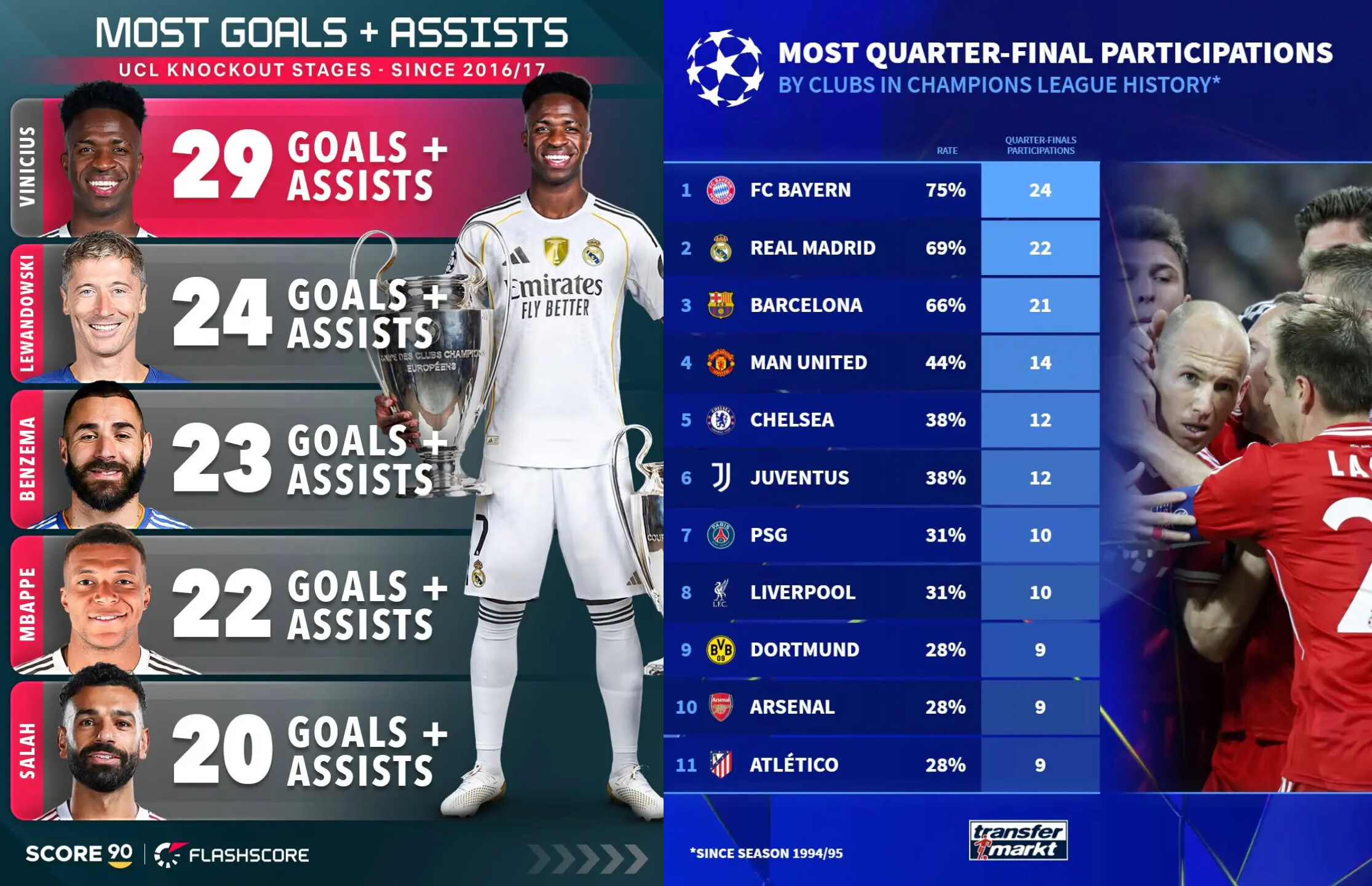 Şol bir wagtyň özünde toparlaýyn statistika hem üns çekýär. "Transfermarkt" portaly tarapyndan berlen maglumatlaryna görä, «Bawariýa» topary 1994/95 möwsüminden bäri Çempionlar ligasynda iň köp çärýek finala çykan topar boldy. Mýunhenliler bu tapgyra jemi 24 gezek çykdy.