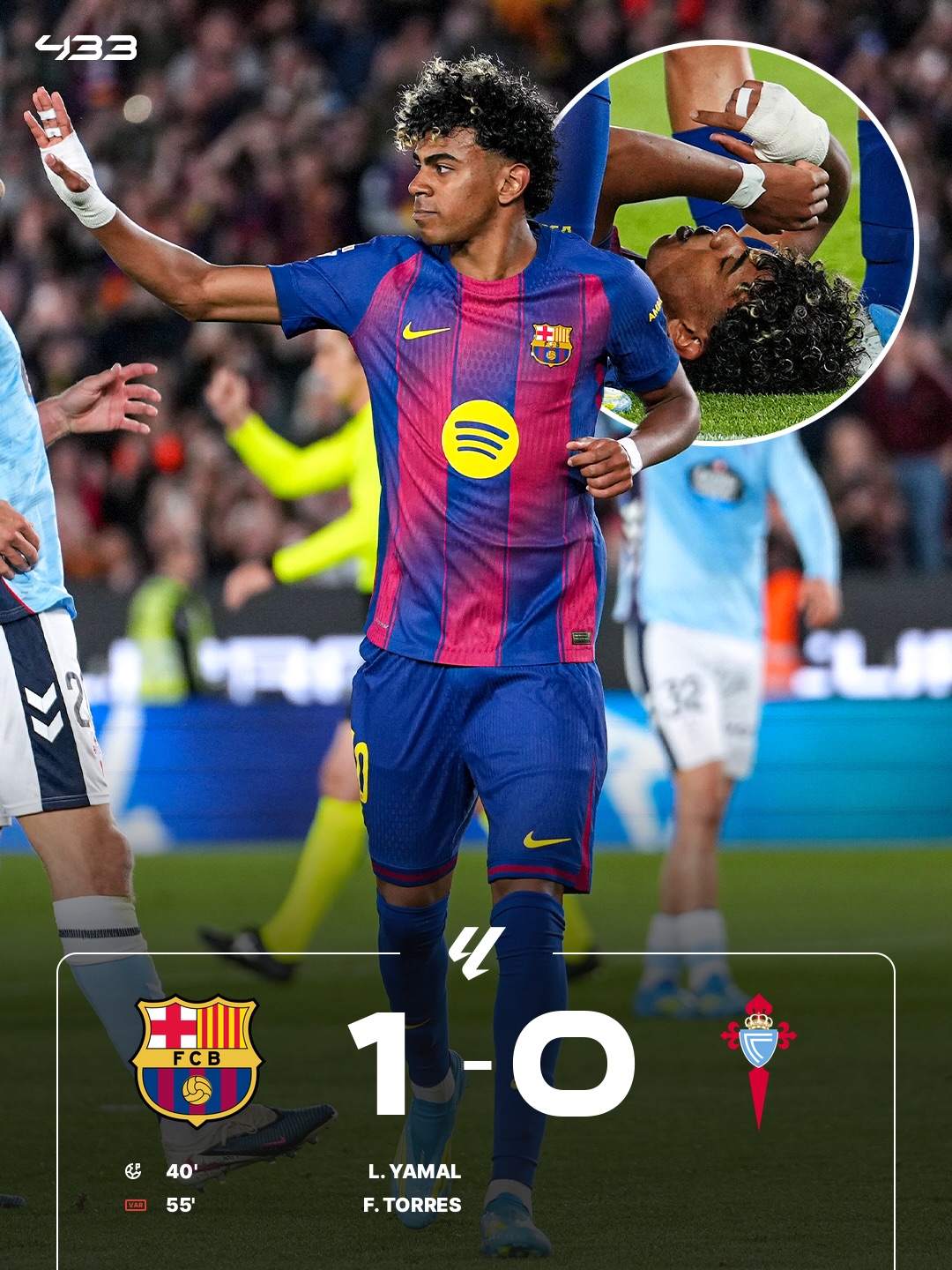Şeýle-de bu duşuşyk «Barselona» üçin ýeňiş bilen birlikde ýaramaz ýagdaý bilen hem tamamlandy. Toparyň ýaş ýyldyzy Lamin Ýamal gol geçireninden soň şikes alyp, meýdançany terk etmeli boldy. Ilkinji barlaglara görä, onuň çep aýagynyň arka myşsasynda dartylma ýüze çykaryldy. Žurnalistler Helena Kondis, Ferran Martines we Roker Torello dürli maglumatlary ýetirýärler – olaryň käbiri Ýamalyň möwsümi doly goýberip biljekdigini belleýär. Şeýle-de onuň tomusda geçiriljek Dünýä çempionatyna gatnaşyp bilmezlik howpy hem bar. Häzirki wagtda oýunçy goşmaça lukmançylyk barlaglaryna garaşýar we dikeldiş möhleti soň belli bolar.