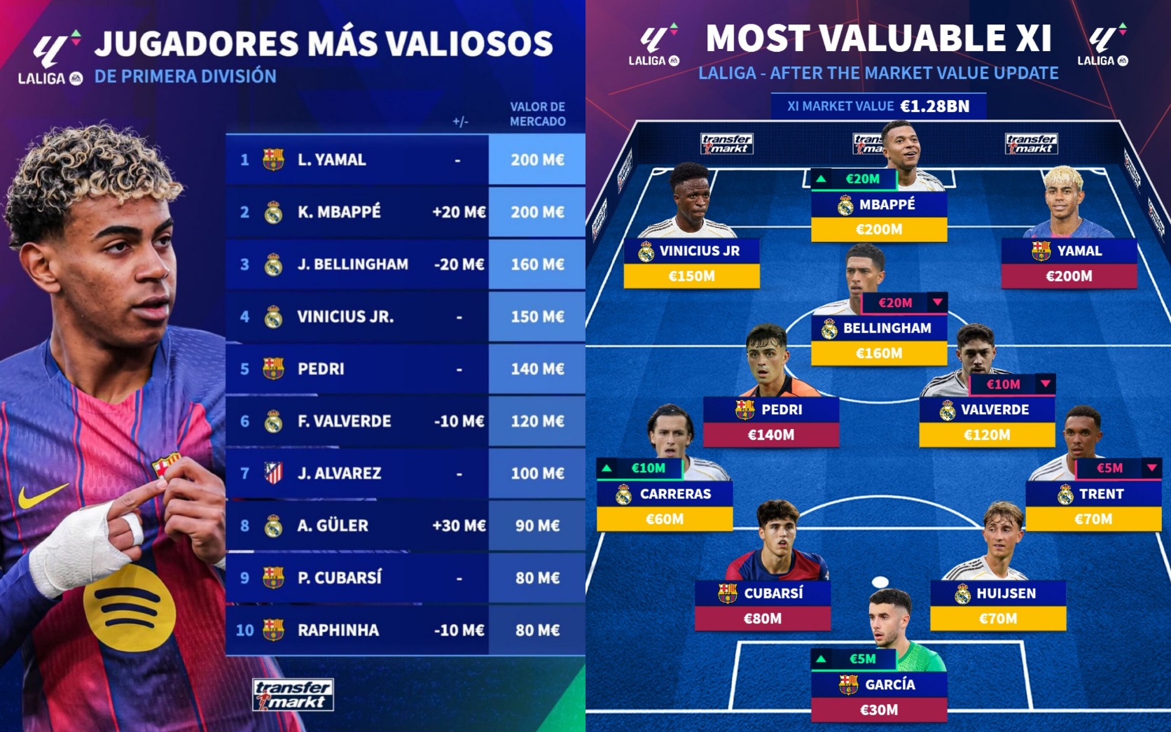 • Olaryň ikisi hem €200 million gymmat bilen bahalandyryldy, bu bolsa olary Ispaniýanyň çempionatynyň iň gymmat futbolçylary edýär.