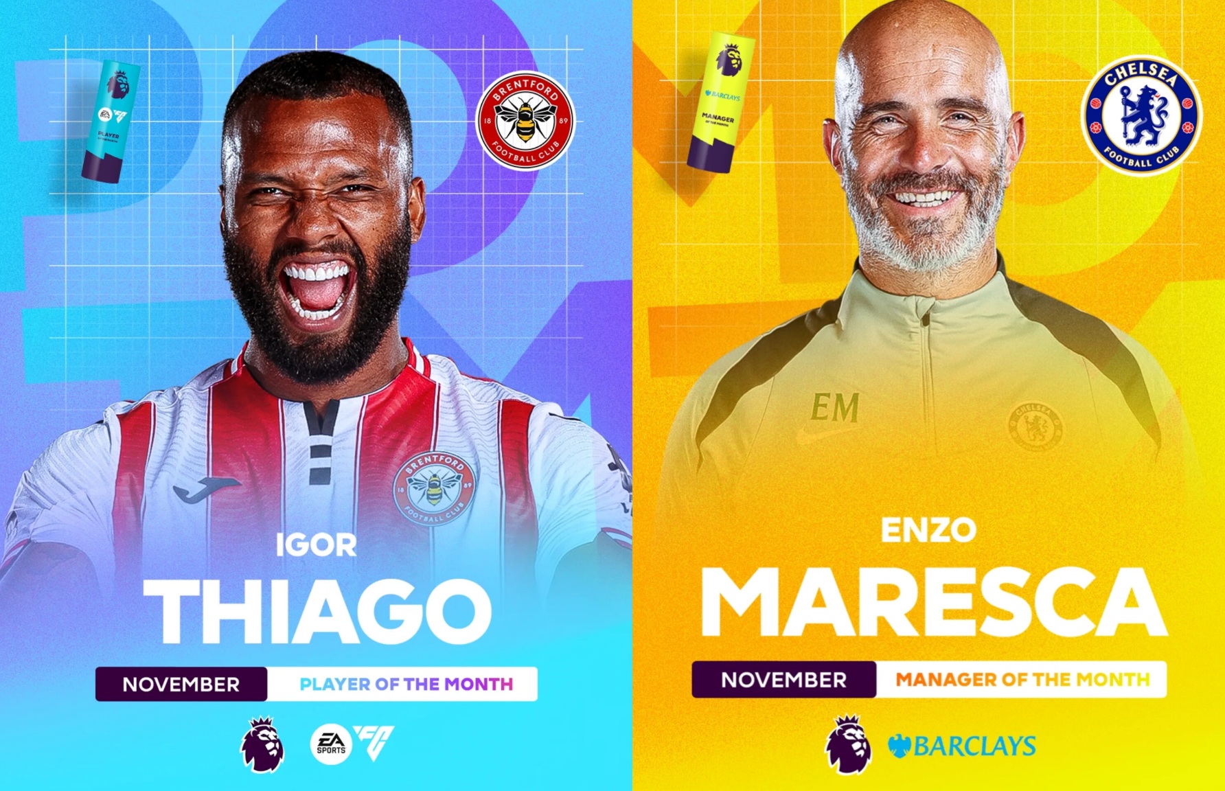 Angliýanyň Premýer-ligasy (APL) noýabr aýynyň netijeleri boýunça iň gowy oýunçy we tälimçi üçin ses berlişigiň netijelerini yglan etdi. Baýraklar iki klubyň – «Brentfordyň» we «Çelsiniň» wekillerine gowşuryldy.