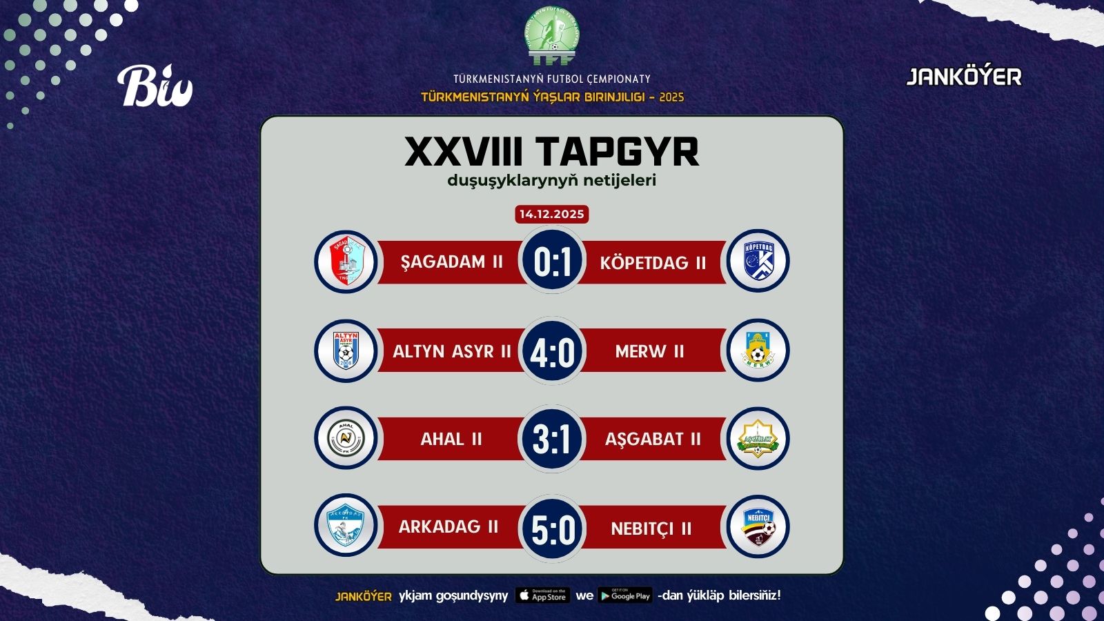 Şu gün, 14-nji dekabrda, Ýokary liganyň futbol klublarynyň ýaşlar düzümleriniň gatnaşmagyndaky futbol boýunça Türkmenistanyň birinjiliginiň soňky, 28-nji tapgyrynyň duşuşyklary geçirildi.