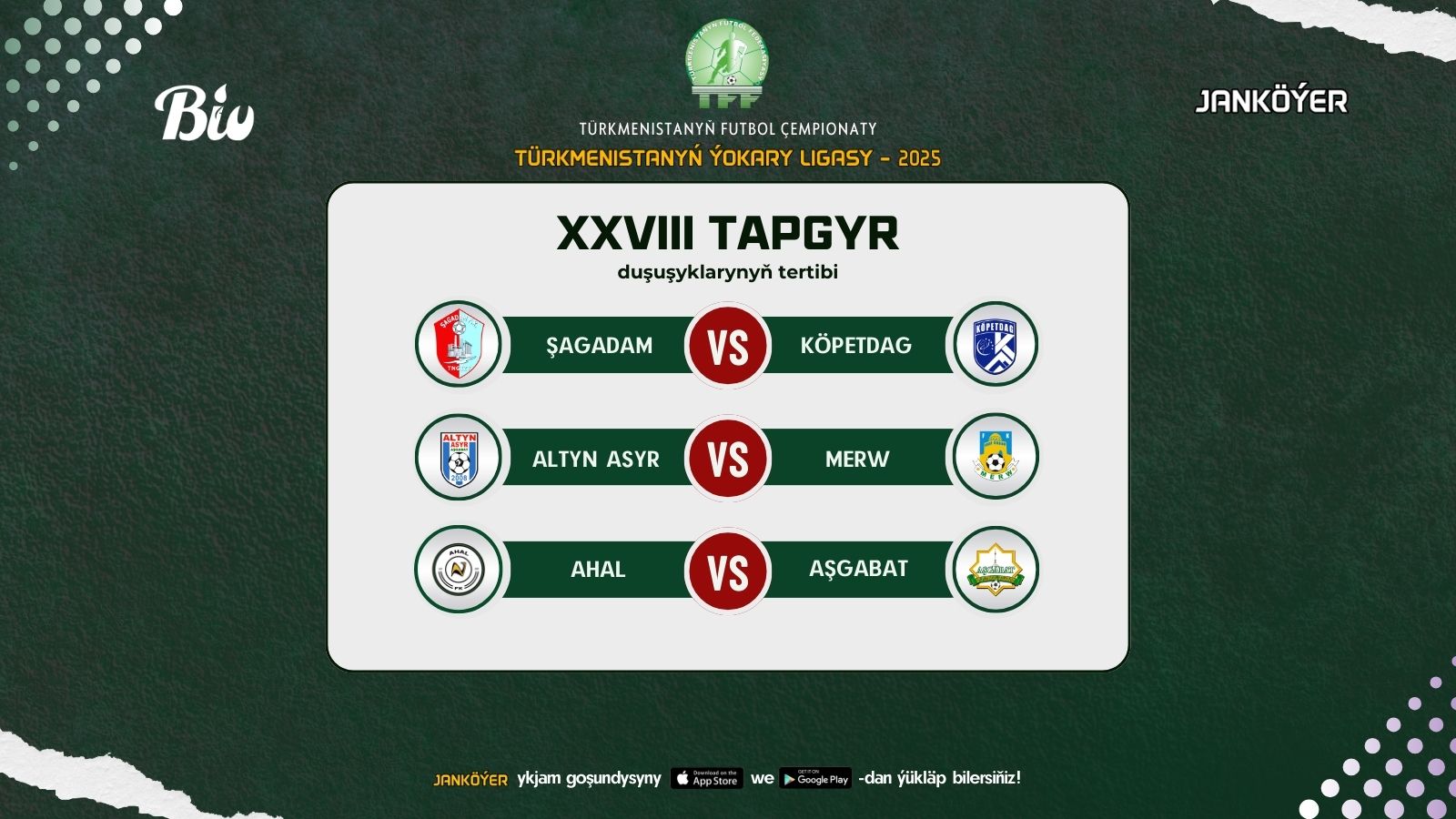 Şu gün, 15-nji dekabrda, Türkmenistanyň futbol çempionatynyň jemleýji, 28-nji tapgyrynyň galan duşuşyklary geçiriler. Çempionatda «Arkadag» topary eýýäm çempionlygy yglan etdi we 28 oýnuň ählisinde ýeňiş gazanmak rekordyny goýdy.