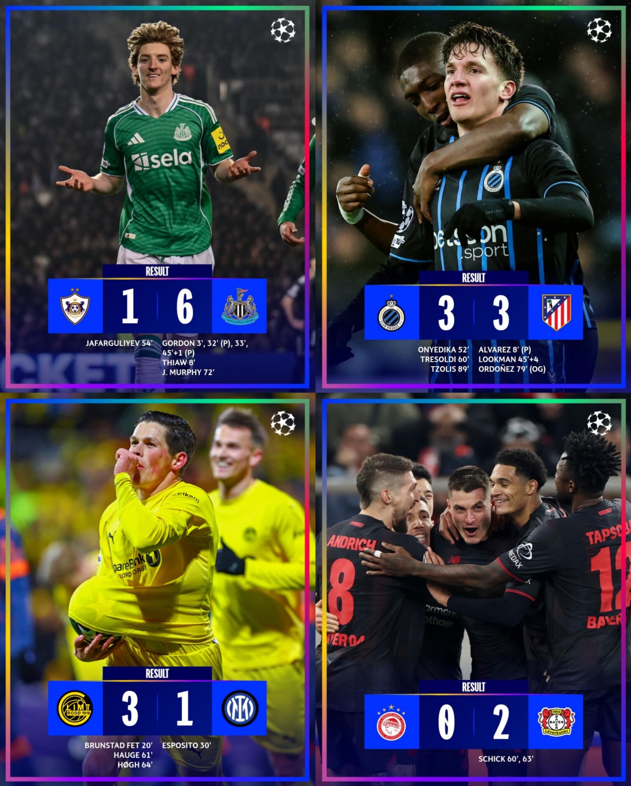 Tapgyryň beýleki duşuşyklarynda «Galatasaraý» – «Ýuwentusy» 5:2 ýeňdi, «Real» myhmançylykda «Benfikadan» 1:0 üstün çykdy, «Borussiýa Dortmund» – «Atalantany» 2:0 hasabynda ýeňdi, «PSŽ» bolsa «Monakony» 3:2 ýeňdi.