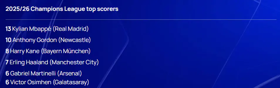 Iň köp gol geçirenleriň sanawynda «Real Madridiň» hüjümçisi Kilian Mbappe 13 gol bilen öňdeligi saklaýar. Ikinji orunda 10 gol bilen Entoni Gordon ýerleşýär. Üçünji orny 8 gol bilen «Bawariýanyň» hüjümçisi Harri Keýn eýeleýär. Şeýle hem 7 golly Erling Holand («Mançester Siti») we 6 golly Gabriel Martinelli («Arsenal») bilen Wiktor Osimhen («Galatasaraý») sanawyň öňünde barýar.