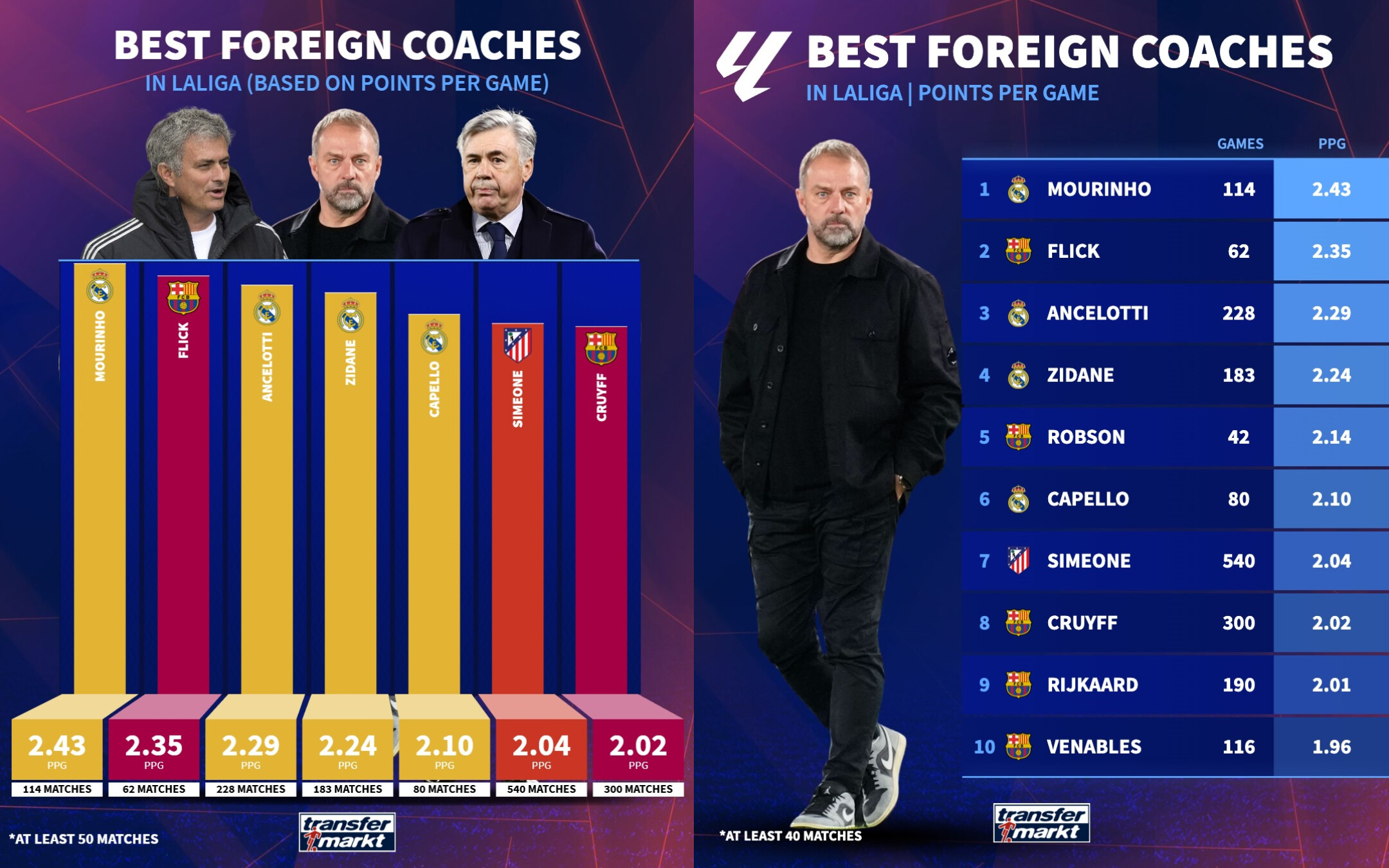 Ikinji orunda häzirki wagtda «Barselona» klubyň baş tälimçisi Hans-Diter Flik ýerleşýär. Ol her oýunda ortaça 2,35 utuk gazanýar. Üçünji basgançakda bolsa «Real Madrid» bilen işlän beýleki bir tälimçi Karlo Ançelotti bar, onuň görkezijisi 2,29 utuga deň.