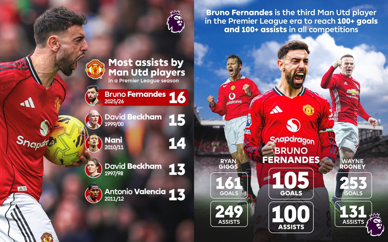 Mundan başga-da Bruno Fernandeş Angliýanyň çempionatynyň döwründe «Mançester Ýunaýtedde» ähli ýaryşlarda 100-den gowrak gol hem-de 100-den gowrak asist eden üçünji futbolçy boldy. Ondan öň şeýle görkezijä diňe Ueýn Runi hem-de Raýan Giggz ýetipdi.