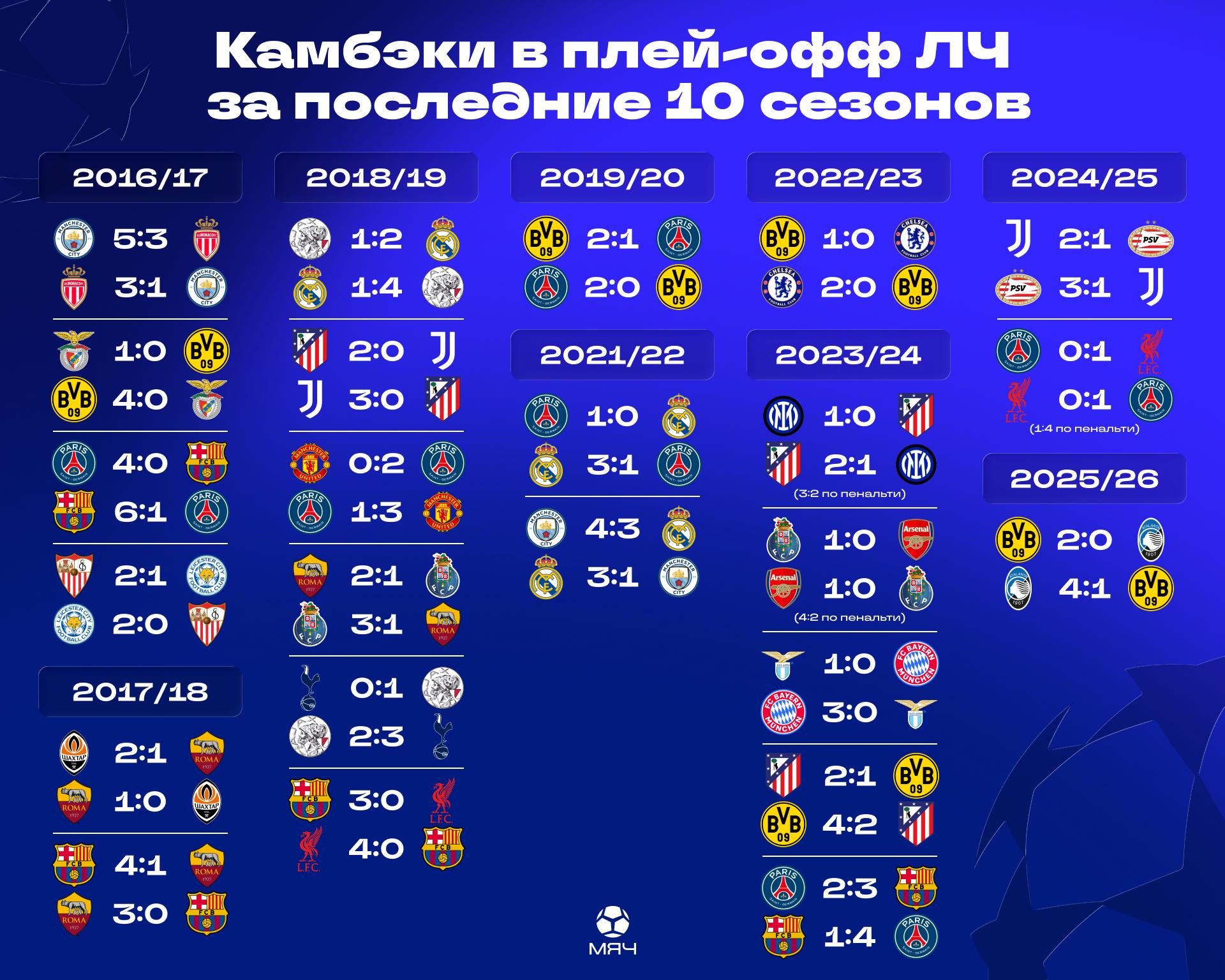 Çempionlar ligasynyň pleý-off tapgyrynda ilkinji duşuşykda ýeňilen toparlaryň yzyna dolanyp, indiki tapgyra geçmegi soňky 10 möwsümde 24 gezek gaýtalandy.