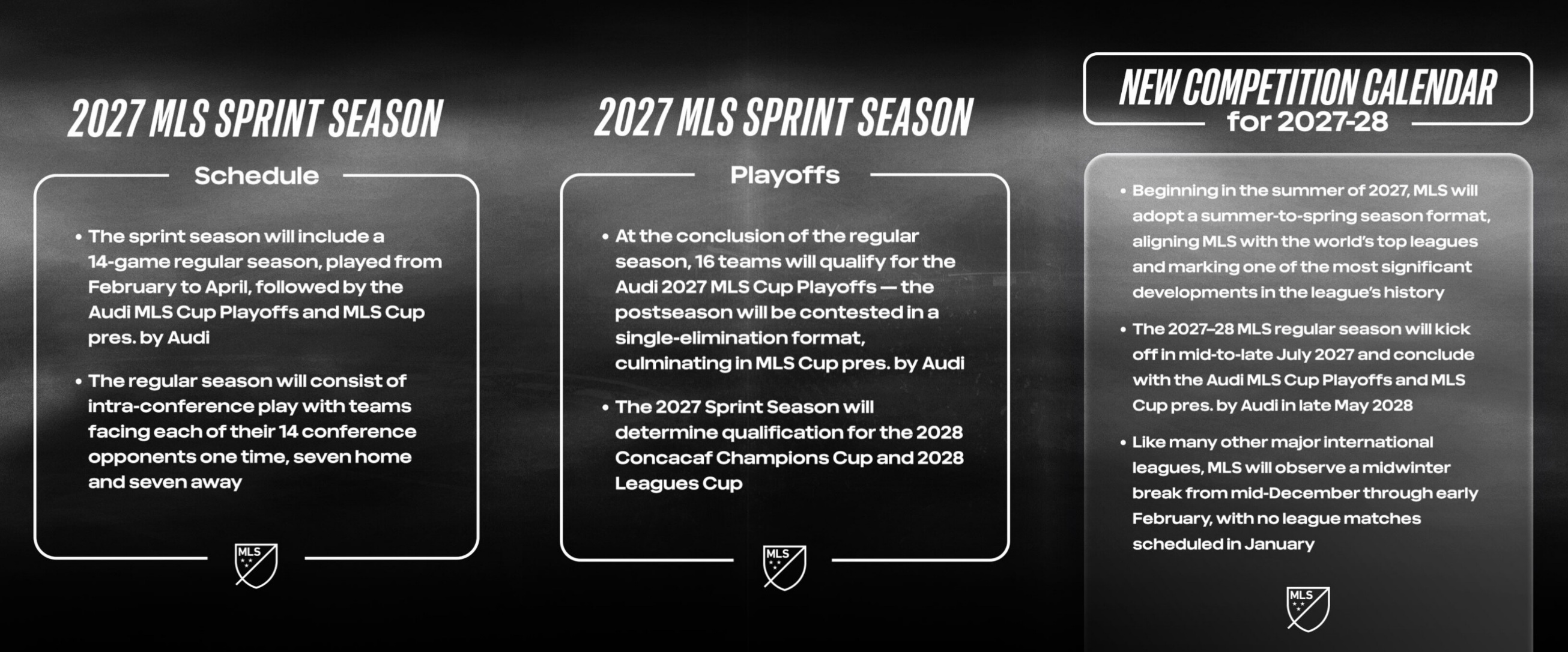 Şeýle hem şol ýylyň tomsundan başlap MLS doly derejeli täze möwsüm ulgamyna geçer. 2027–2028 möwsümi iýul aýynda başlap, indiki ýylyň maý aýyna çenli dowam eder. Bu ulgam dünýäniň öňdebaryjy ligalary ýaly gurnalar.