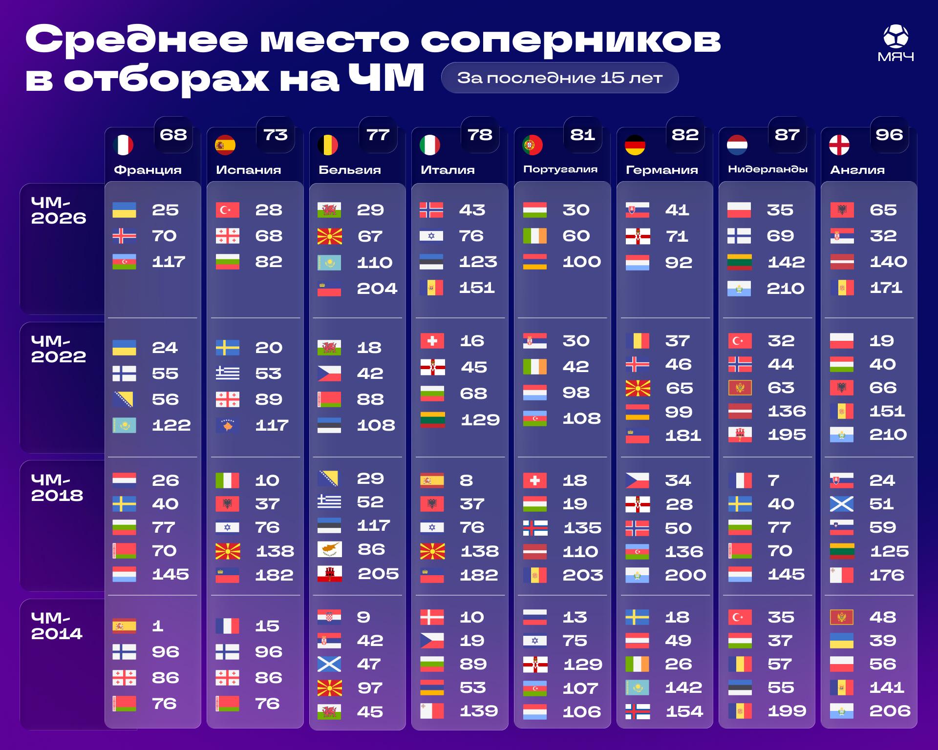 Bu görkeziji Italiýa üçin kyn ýaly görünse-de, beýleki öňdebaryjy milli ýygyndylar bilen deňeşdirilende ýagdaý başgaça bolýar. Mysal üçin, Fransiýanyň milli ýygyndysy saýlama tapgyrlarynda has güýçli garşydaşlar bilen duşuşmaly boldy. 2014-nji ýylyň Dünýä çempionatynyň saýlama tapgyrynda olar şol wagtky Dünýä we Ýewropa çempiony bolan Ispaniýanyň milli ýygyndysy bilen oýnady. 2018-nji ýylyň saýlama döwründe bolsa güýçli garşydaşlaryň biri bolan Gollandiýanyň milli ýygyndysy olaryň ýoluna çykdy.