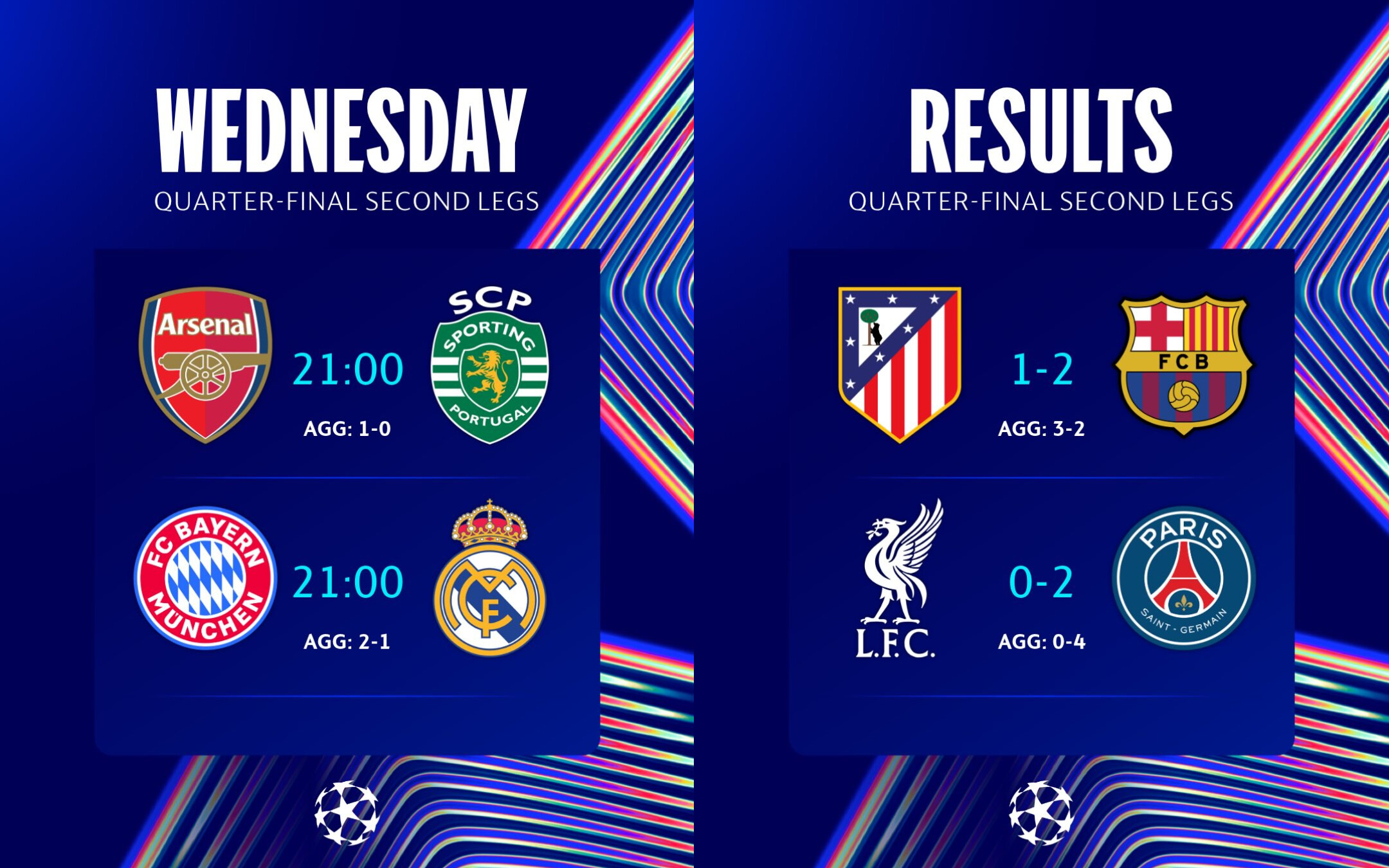 UEFA-nyň Çempionlar ligasynyň çärýek finalynyň jogap duşuşyklary futbol janköýerlerine uly gyzyklanma döredýär. Iki esasy garşylaşyk hem 15-nji aprelden 16-njy aprele geçýän gije Aşgabat wagty bilen sagat 00:00-da başlanar.